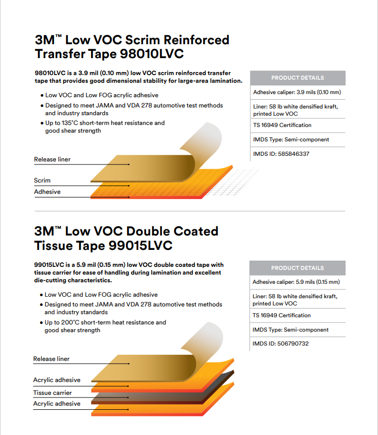 3M™低VOC带丙烯酸粘合剂99015LVC胶带专为汽车内饰应用而设计,适用于常用泡沫基材,例如PU酯和EPDM,以及高表面能 (HSE)和低表面能(LSE)基材。 薄胶带上的纯丙烯酸粘合剂设计为低雾和低排放,以满足汽车原始设备制造商和一级供应商使用的 JAMA和VDA278测试方法中规定的VOC要求。