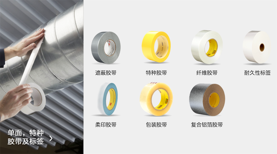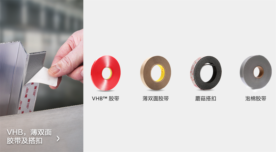 从能够替代铆接,同时兼具胶带的简易操作性的3M™ VHB™ 多功能强力双面胶,到可以在严酷条件下仍能保持牢固的持久粘接效果的3M™ Scotch-Weld™ 结构胶,以及耐高温胶带,薄双面胶带,转移胶膜,遮蔽胶带,布基胶带,高强度胶带,纤维胶带,特种胶带,蘑菇搭扣,耐久性标签,柔印胶带,密封胶,溶剂胶,水性胶,热熔胶等…3M工业胶带胶黏剂产品家族能帮助设计和工艺工程师们摒弃传统机械固定方式,实现更多设计的灵活性,轻松、快速粘接多种新型材料,提升生产效率。